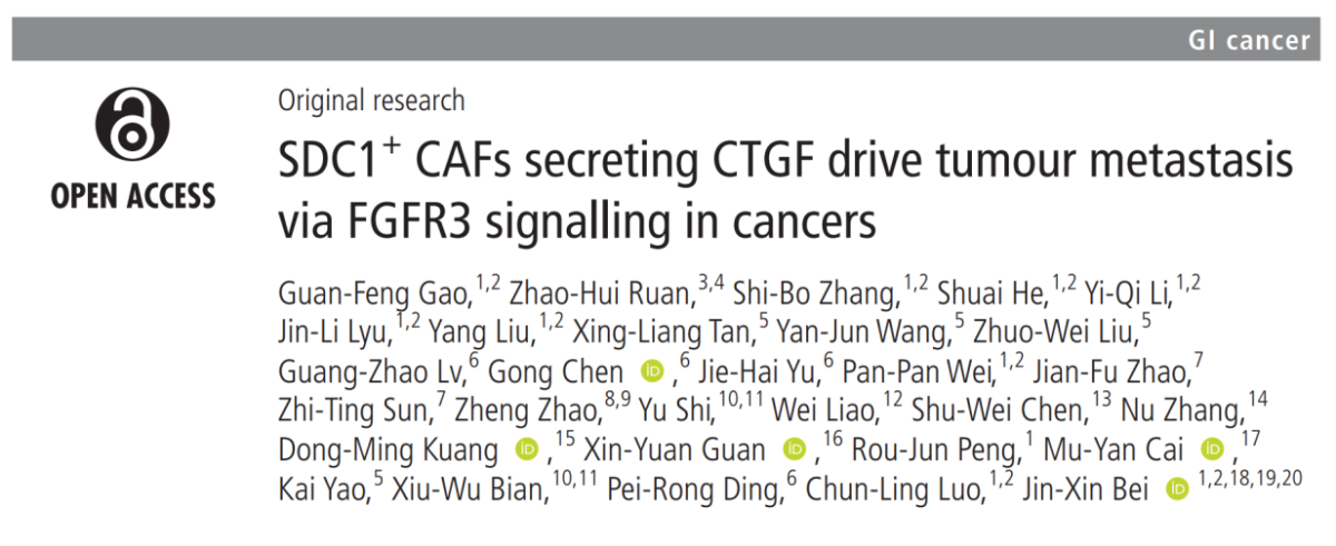 近日,中山大学肿瘤防治中心研究员、中山大学香港高等研究院院长助理贝锦新和中山大学肿瘤防治中心副研究员罗春玲团队在国际权威期刊Gut上发表题为SDC1⁺ CAFs secreting CTGF drive tumour metastasis via FGFR3 signalling in cancers的研究论文。该研究整合了来自14种癌症类型的单细胞转录组数据,系统构建了泛癌CAFs的单细胞图谱。研究鉴定出一种在多种实体瘤中普遍存在、呈肿瘤特异性富集,并与淋巴结转移及患者不良预后显著相关的 SDC1⁺ CAFs 亚群。进一步结合体内外实验模型及分子机制研究,系统阐明了该亚群在肿瘤转移中的生物学功能及其作用机制,为实体瘤抗转移治疗提供了具有重要转化潜力的基质靶点。
