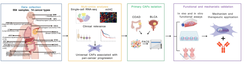 癌症相关成纤维细胞(Cancer-associated fibroblasts,CAFs)是肿瘤微环境中最主要的基质细胞成分之一,在肿瘤发生、进展及转移过程中发挥关键调控作用。研究表明,CAFs可通过细胞外基质(ECM)重塑、分泌可溶性因子及外泌体,促进血管生成、免疫逃逸和代谢重编程,并通过与肿瘤细胞、免疫细胞及内皮细胞的复杂互作推动癌症恶性进展。然而,CAFs具有高度异质性,不同亚群在起源、表型和功能上存在显著差异。尽管已有少数研究从泛癌层面初步解析了CAFs的单细胞图谱,但针对关键亚群的功能特征及其分子调控机制仍缺乏系统性阐明。因此,鉴定泛癌保守的关键CAFs亚群并解析其功能与调控网络,对于全面揭示CAFs在肿瘤微环境中的功能角色具有重要意义,并有望为肿瘤治疗提供新的潜在干预靶点和策略。