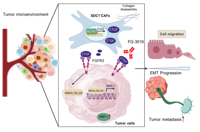 图2.SDC1+ CAFs通过KLF6-CTGF-FGFR3信号轴促进肿瘤转移的分子机制示意图